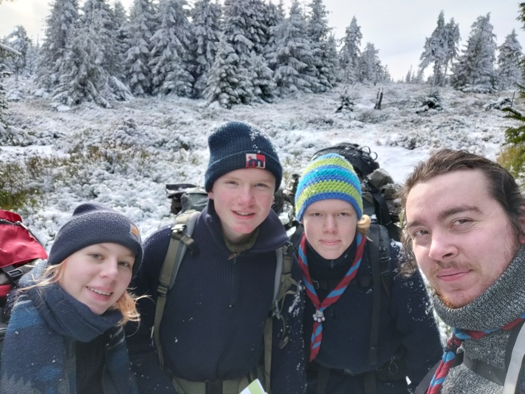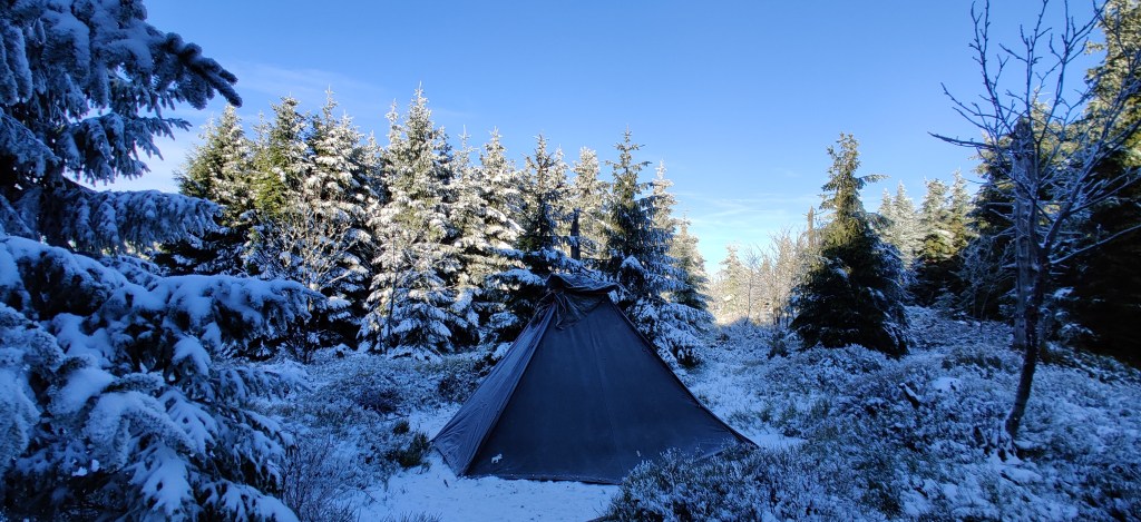 Am nächsten Morgen erwachten wir durch strahlenden Sonnenschein, aber noch immer war es eisig kalt. Unsere Kohtenbahnen waren mit einer dicken Schicht Raureif überzogen und komplett steif gefroren, sodass wir beim Zusammenlegen stark aufpassen mussten, dass sie uns nicht zerbrechen. Letztendlich haben wir es trotzdem verlustfrei geschafft (was ziemlich gut war, denn so eine Kohtenbahn ist echt teuer). Zum Frühstück bekamen wir dann doch ein Feuer an, indem wir das innere Holz eines noch stehenden, aber abgestorbenen Baumes nahmen. Den Tag über wanderten wir dann 25km bis zur Hans-Künen-Burg. Während der Wanderung weichten aber langsam unsere Schuhe durch, weil man immer wieder Schnee von oben in die Schuhe bekam, die ohnehin schon dauerhaft der Nässe von Außen ausgesetzt waren. Ursprünglich wollten wir querfeldein über das Moor „Auf dem Acker“ wandern. Ich hatte jedoch meinen Kompass erfolgreich zu Hause liegengelassen und durch den Schnee sah das Moor überall gleich aus. So irrten wir dann einige Stunden vergeblich auf dem Moor hin und her. Demnach war es dann schon Zwei Uhr Nachmittags, als wir noch 15km Strecke vor uns hatten. Spätestens um fünf Uhr würde es schon dunkel sein.